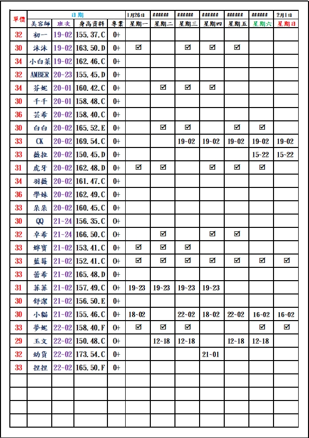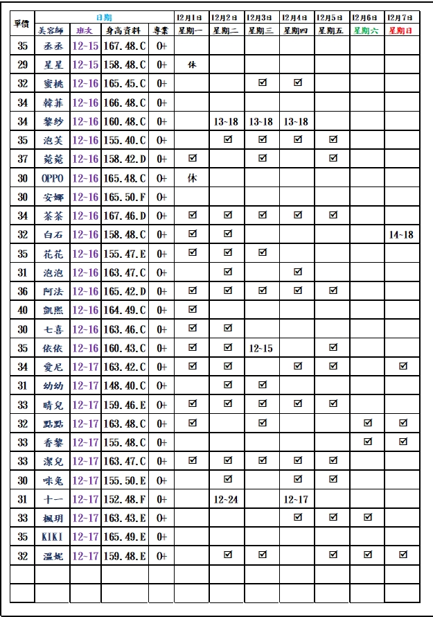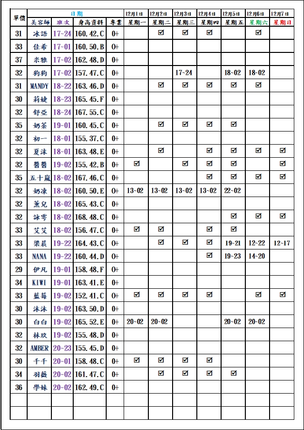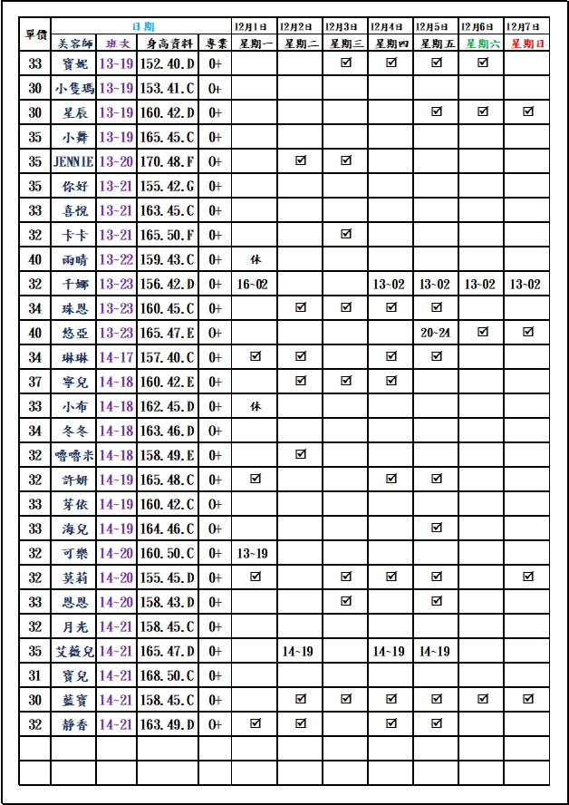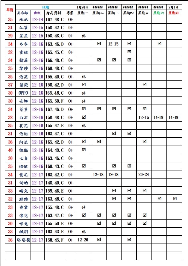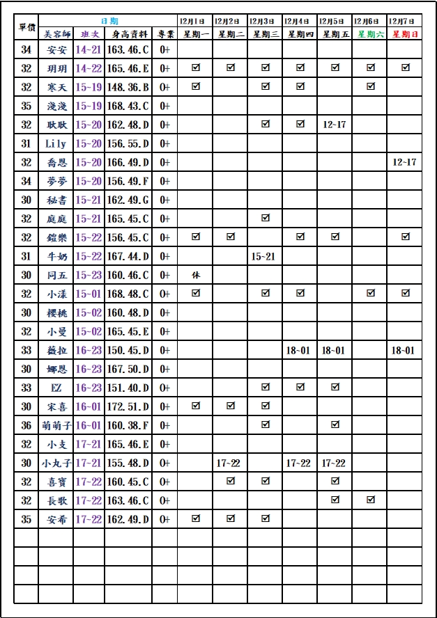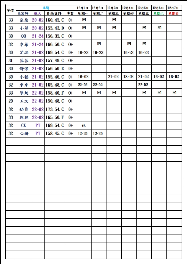 有打勾即報班,若寫時段,代表當日為該上班時段