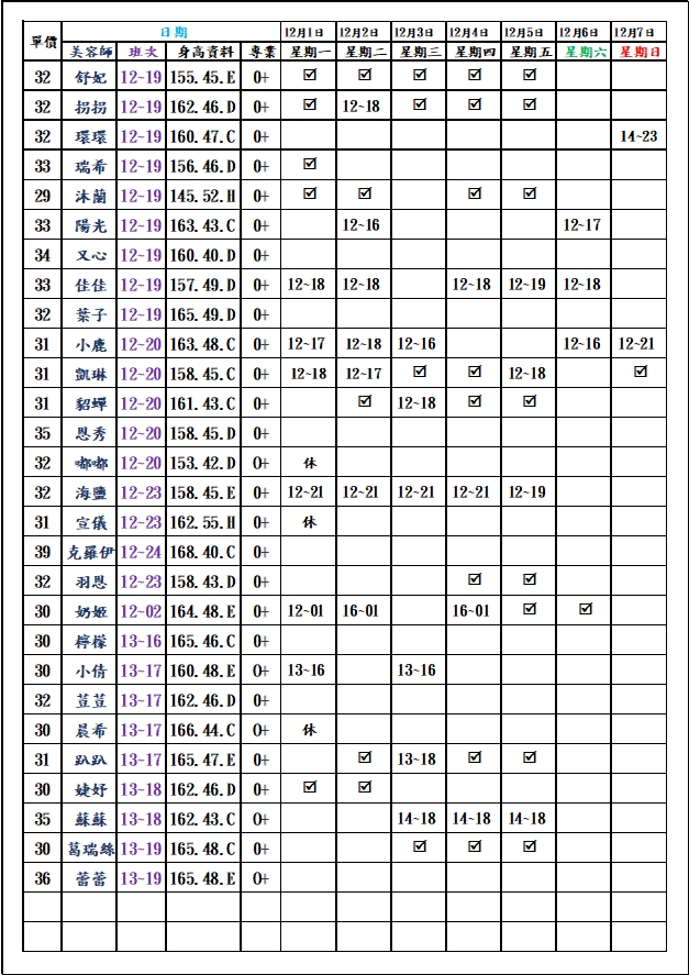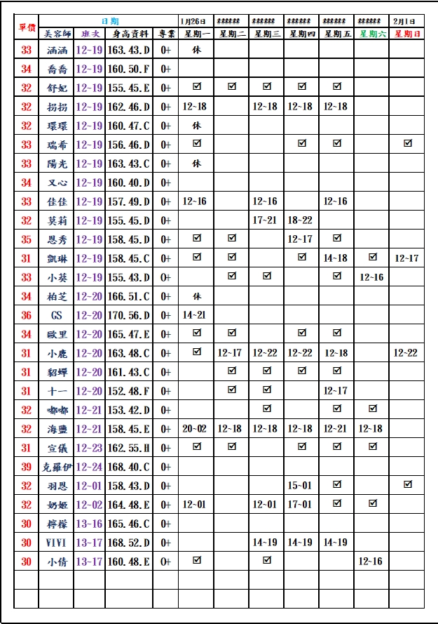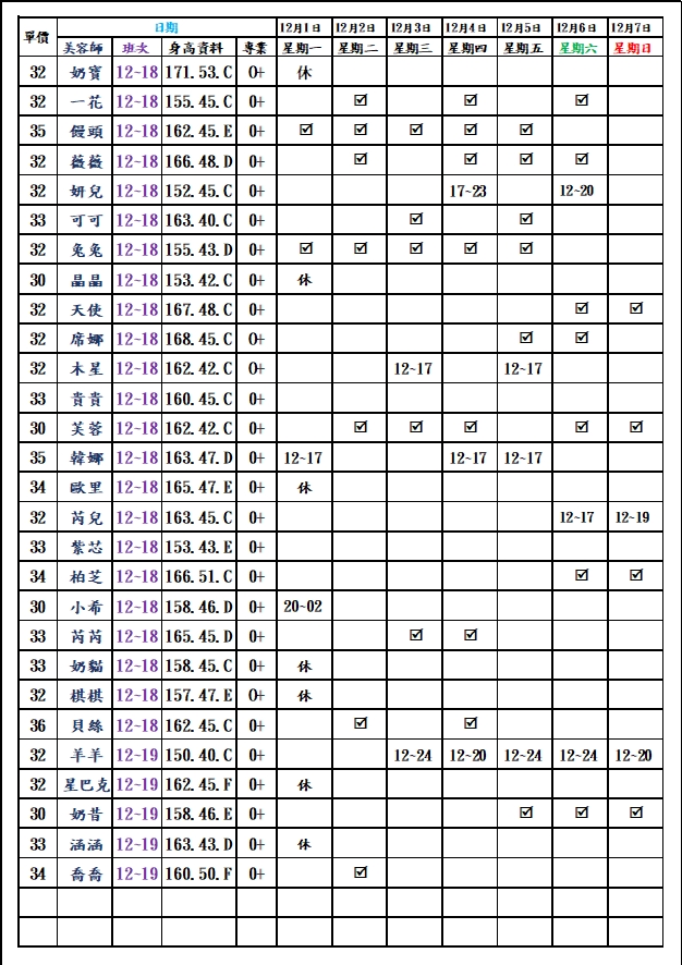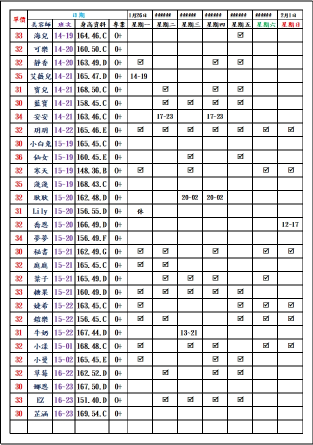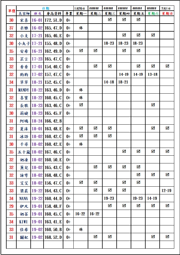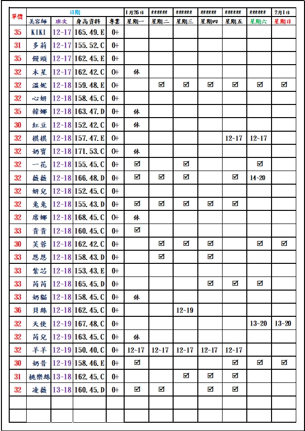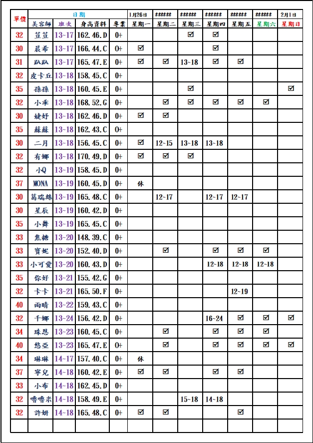 有打勾即報班,若寫時段,代表當日為該上班時段