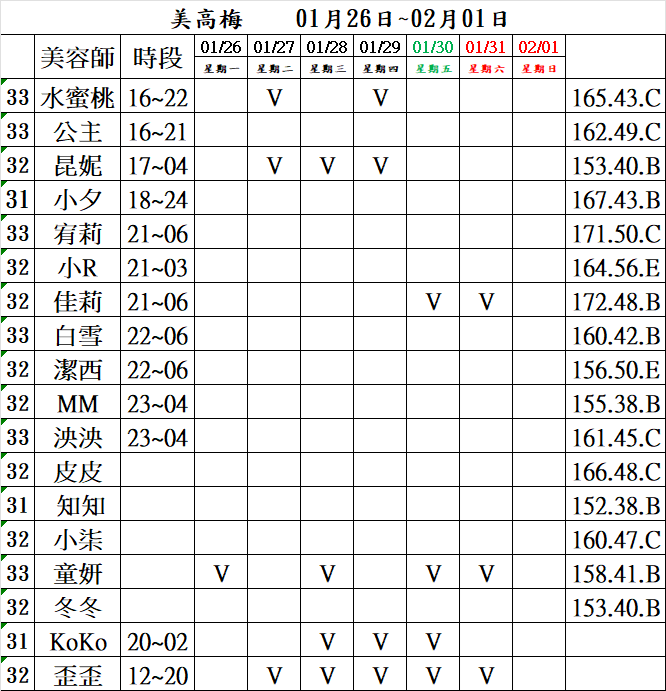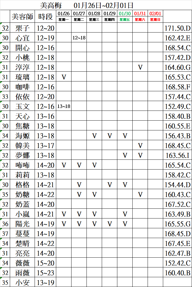 有打勾即報班,若寫時段,代表當日為該上班時段